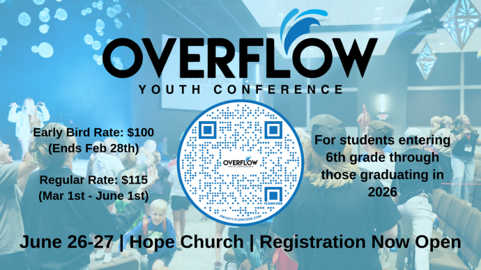 Overflow Youth Conference is a weekend designed to inspire equip, and refresh middle and high school students in their faith. Overflow is built on Romans 15:13: "May the God of...